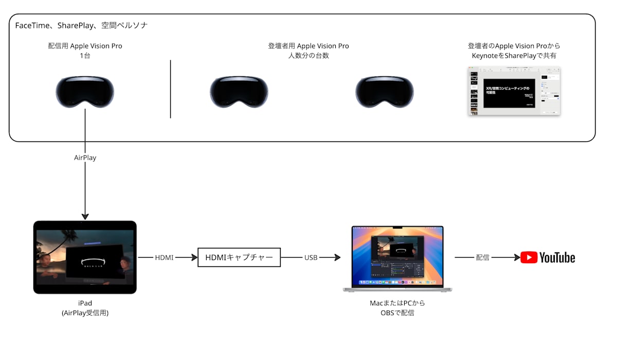 流れは配信用 Apple Vision Pro の映像をAirPlayで受け取るためのiPadなどへ送信し、iPadからHDMIで出力したものをUSBに変換して、Mac/PCのOBSに入力、YouTubeへ配信となります。