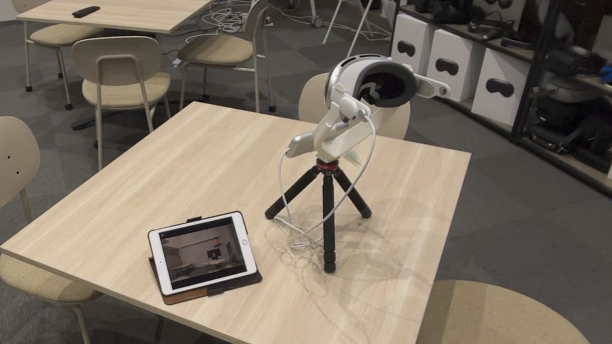 配信用も同様にFaceTimeに参加し空間ペルソナをオンにします。Apple Vision Proはこのように SHINOBU工房 | 【フルキット】 Apple Vision Pro デモセット v2 を使用し三脚への固定します。合わせて、付属している「KeepON マスク」で Apple Vision Pro を人が装着していない状態でもスリープせず動作可能にします。