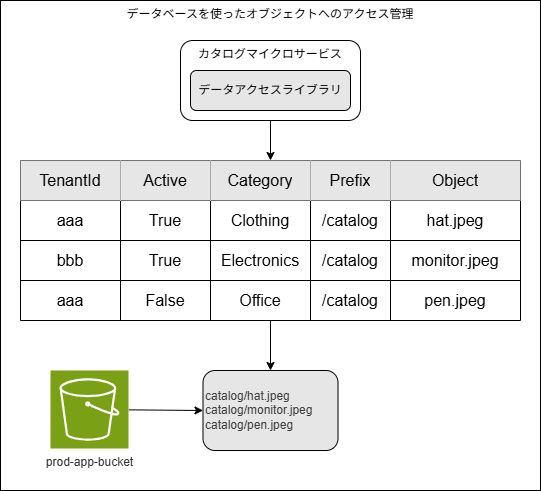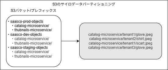 右側には各バケット・プレフィックス内にグループ化されたオブジェクト構造があります。プールモデルであれば、テナントとオブジェクトを関連づけるために、テナント識別子がオブジェクト名に付与される形となります。