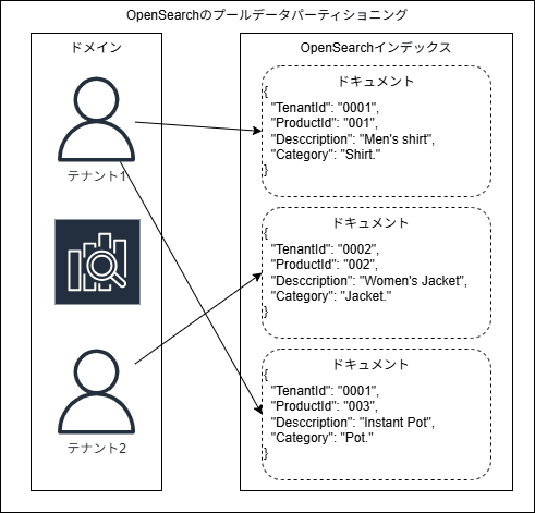 プールモデルでOpenSearchにデータを配置する場合、それは各テナントドキュメントが単一のインデックス内で混在している状況を意味します。