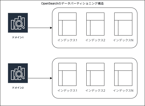 上図の左側には、データパーティショニングの最も粗い粒度の単位となるドメインがあります。右側には、特定のドメインに関連する一連のインデックスがあります。これらのインデックスに、検索と分析のためにインデックス付けされるドキュメントが格納されます。
