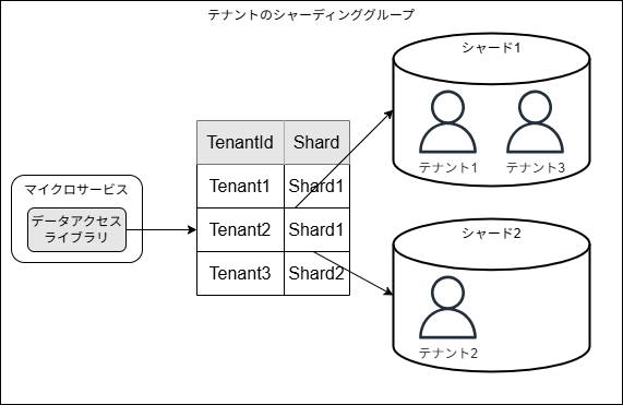 上図の右側には、プールモデルで稼働するテナントの2つの異なるシャードがあります。上図左側のサービスがデータベースにクエリを発行する場合、データアクセスライブラリは指定されたテナントに対応するシャードを検索してアクセスする必要があります。