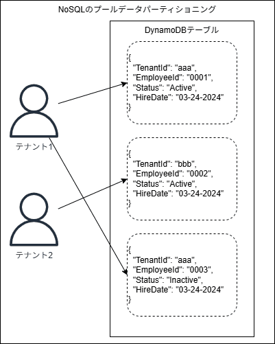 DynamoDBでは下図のように全てのデータはテーブルに格納され、各データにはテナント情報が含まれます。