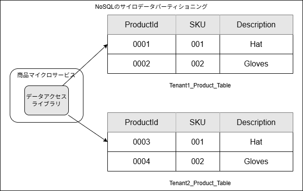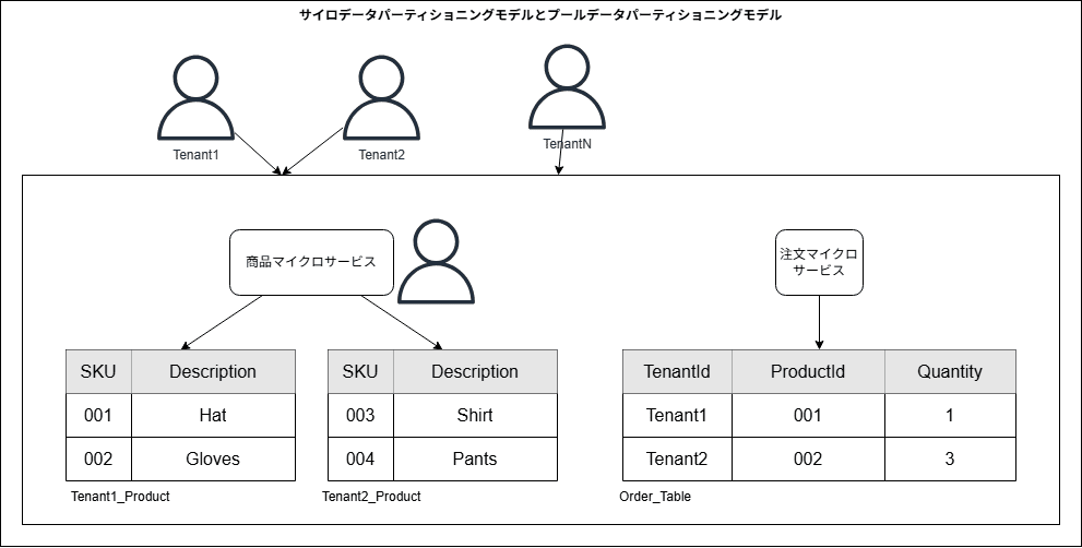 上図の左側では、商品サービスはテナントごとに個別の、サイロ化されたストレージ構造を利用しており、右側では、注文サービスが全テナント間で共用の、プール化されたストレージ構造を利用しています。
