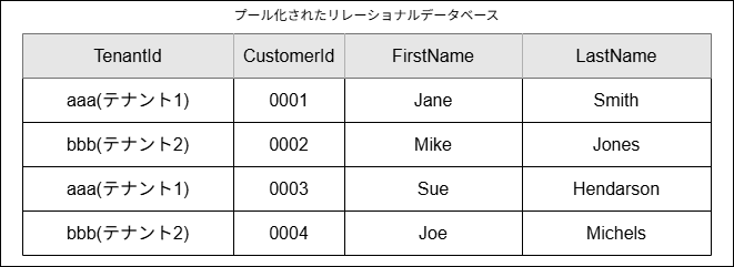 リレーショナルデータベースでプールモデルのデータを保存する仕組みはシンプルです。具体的には下図のように、既存のデータベース設計にテナント識別子を導入して、テーブル内のアイテムを特定のテナント識別子と対応づけるようにするだけです。