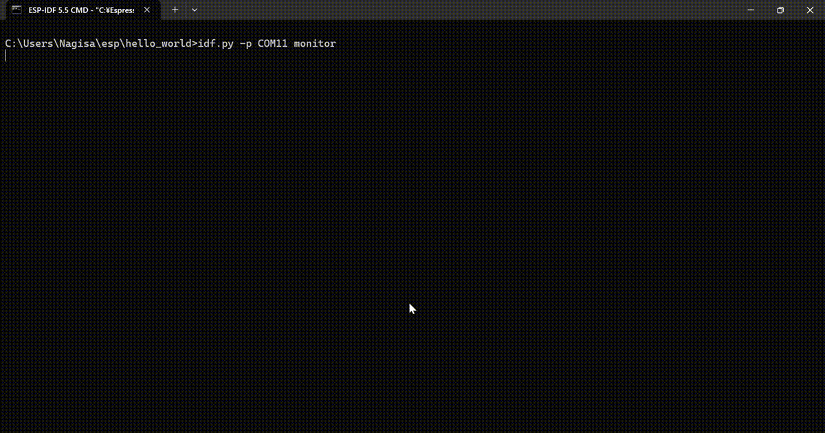 cd 【プロジェクトフォルダ】 idf.py -p COM3 flash monitor