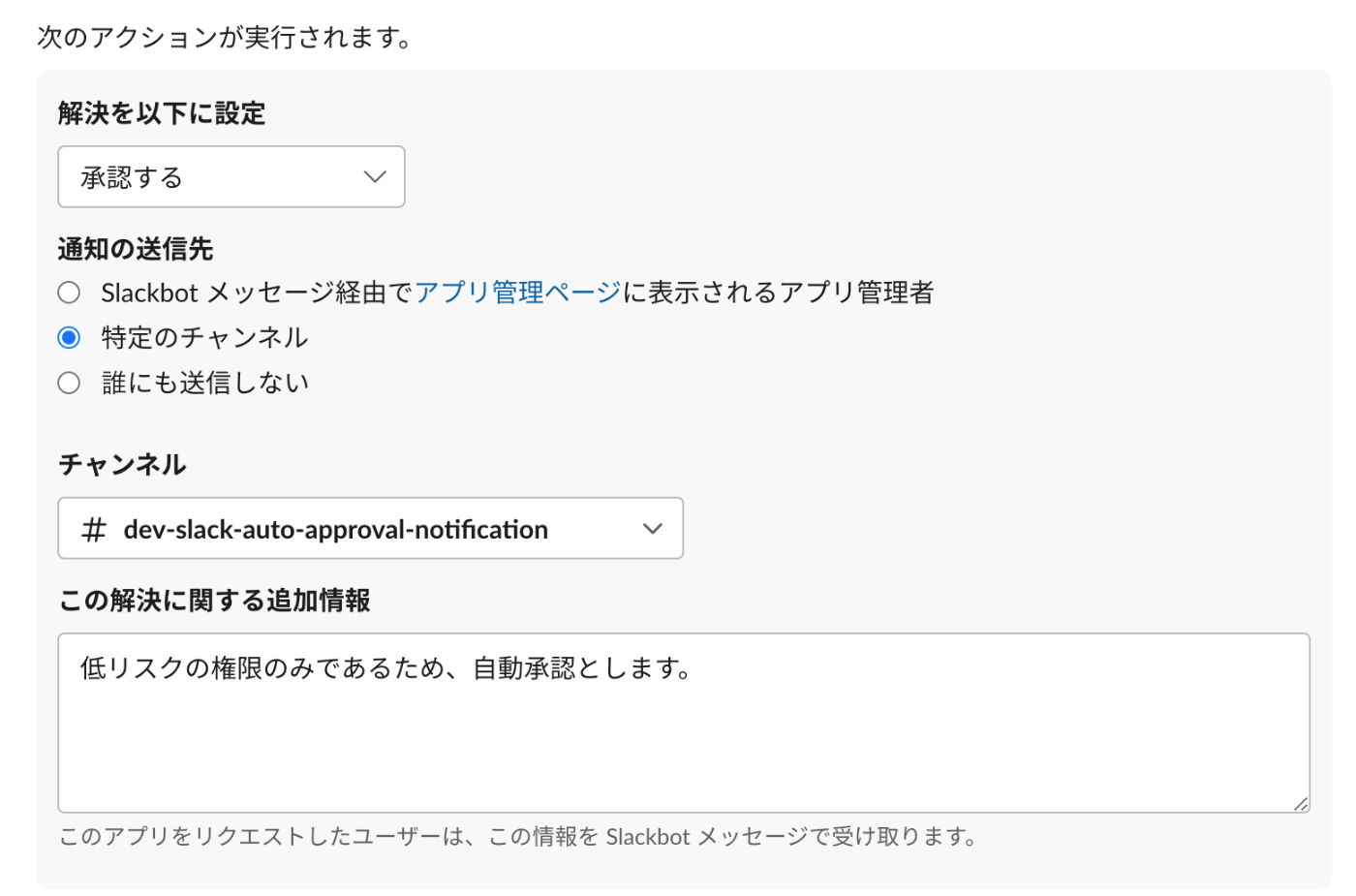 そこで、Incoming-webhookのみのアプリに関しては、自動で承認、それ以外は管理者にてリスク判断を行うことで、エンドユーザーは条件を満たす場合、承認依頼を出したらすぐに利用開始できますし、管理者も判断工数や判断ミスの削減が期待できるので、Win-Winになります。