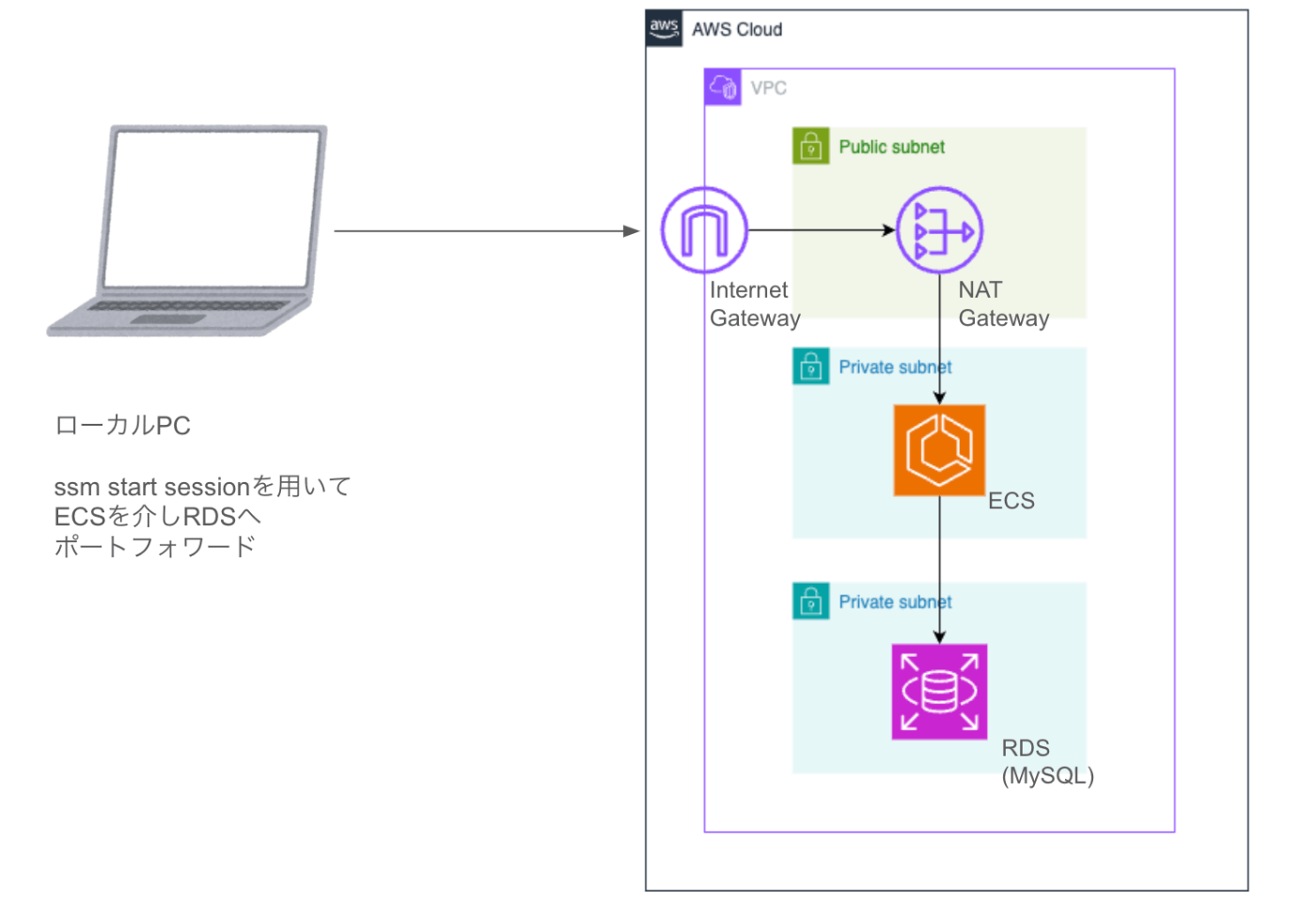 個人開発にてRails(ECS上へデプロイ) x RDS(MySQL)を実装した際にメンテなどでRDSを直接触りたいと思い、せっかくであればモダンな方法で実現したいと思い、調べたところECSで踏み台サーバーのようなことができることを知り、実装してみました。