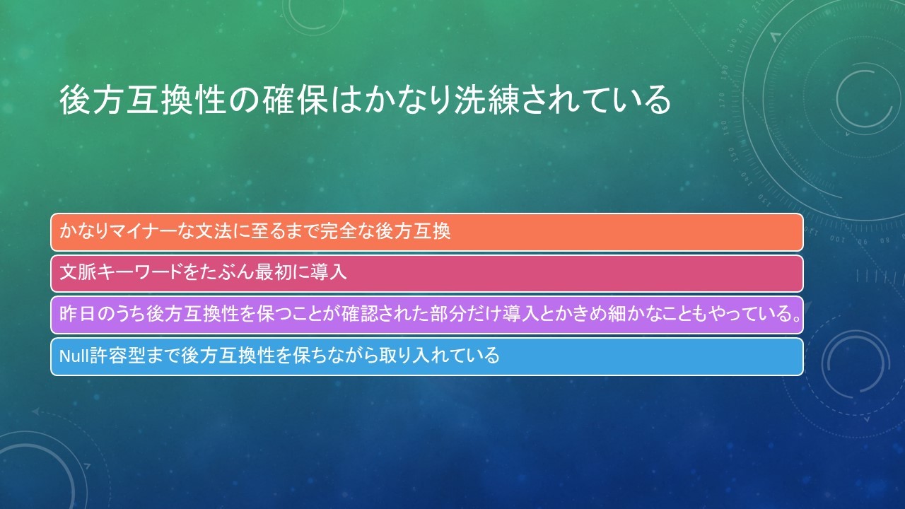後方互換性に対する配慮も素晴らしいです。C#の開発者たちは、ある時期まで、GitHubなどの多くのプログラムを収集して、新しい機能が既存のコードにエラーを引き起こさないか確認していたそうです。つまり、既存ではコンパイルエラーになるようなケースだけに新機能を追加していたんです。