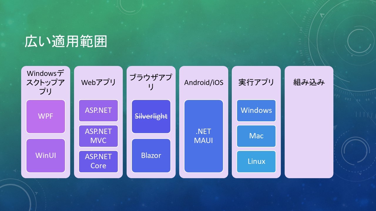 最後に、C#の広い適用範囲について触れておきます。Windowsアプリだけでなく、Webのバックエンドやフロントエンド、さらにはiOSやAndroidアプリの開発にも使えます。また、MacやLinuxにも対応しているため、PowerShellなどもその上で動作します。使える環境が非常に広く、実用性の高い言語です。