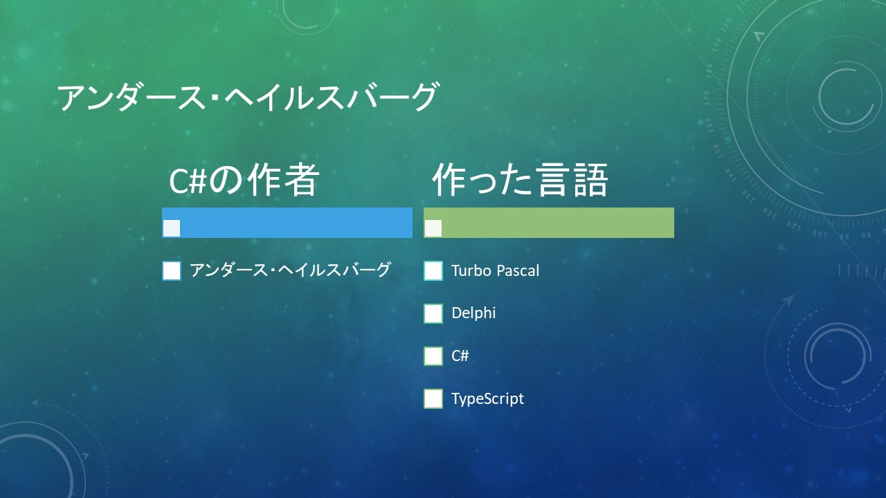 C#の開発者として知られているのはアンダース・ヘイルスバーグです。彼はTurbo PascalやDelphi、最近ではTypeScriptも手がけています。プログラミング界ではすでに何度もその名を轟かせているので、ある意味天才とも言えます。でも、例えばSmalltalkやLispのように、業界の常識を根底から覆すような伝説的な言語ではないかもしれません。C#も、彼一人で作ったわけではなく、チームを率いて作っています。