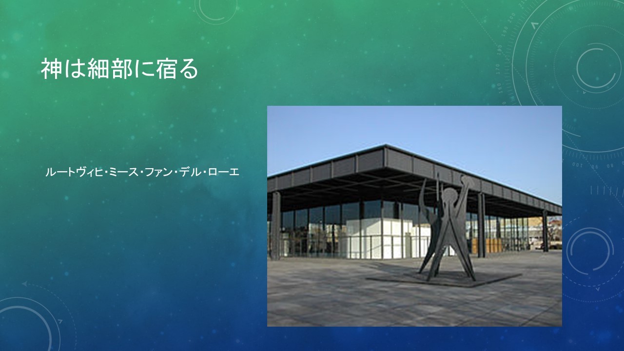 これは建築家のルートヴィヒ・ミース・ファン・デル・ローエの言葉です。「細部こそが重要だ」という意味ですね。彼の建築を見てみるとわかりやすいのですが、全体が完璧に統一されているからこそ、美しく見えるんです。例えば、柱がちょっとでも曲がっていたら全体のバランスが崩れてしまう。それくらい、細部へのこだわりが重要だということです。