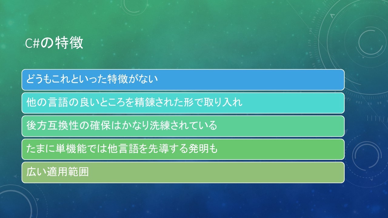 C#にはたくさんの良いところがあるんです。でも、どうも全体として目立った特徴がないというか…
