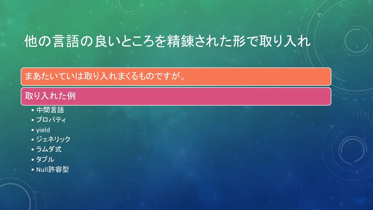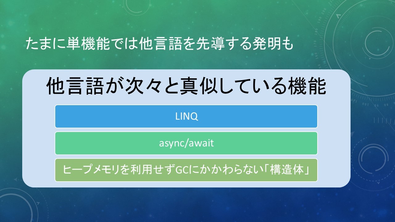 時には、プログラミング全体に影響を与えるような革新的な機能も取り入れられます。例えば、async/awaitはその一つです。この機能は、マルチスレッド処理を簡単に行う方法を提供し、C++やPython、JavaScriptにも取り入れられました。他にも、LINQも有名です。DBやWeb APIとも同じ構文でデータを扱えるようにした機能は、画期的だったと思います。