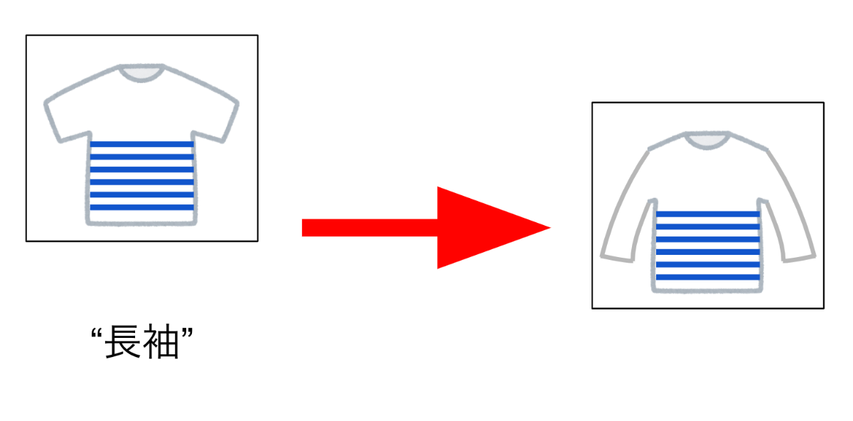 応用先として、 画像検索のテキストによる補正 などに使えます。例えば、長袖のボーダーTシャツを検索したいのに、半袖のボーダーTシャツの画像しか持っていなくても、その画像と「長袖」というテキストを与えるだけで検索できるようにすることです。