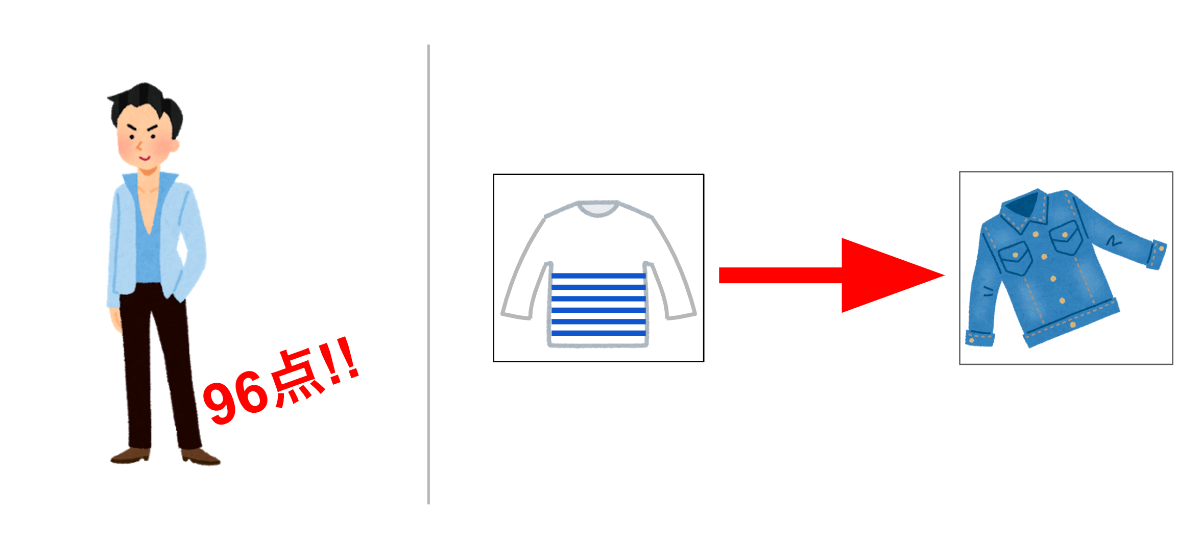 アイテムの相性 を学習させる研究です。例えば、デニムジャケットにはボーダーのTシャツが合う、というようなことを学習させます。 コーデの採点 や アイテムからアイテムの推薦 に使うことができます。