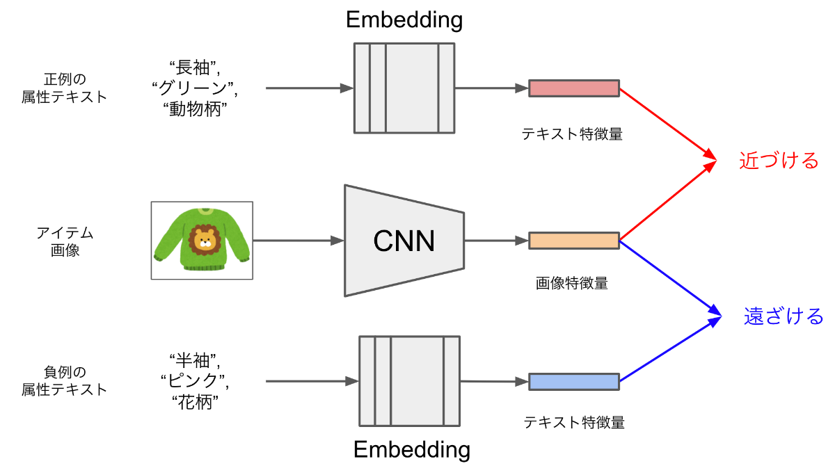 同じアイテムの画像と属性テキストの特徴量を近づける のに使われます。属性テキストとは、アイテムの 袖の長さや模様 などを表した文や単語のことです(※1)。