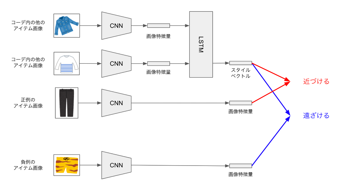 ちなみに、アイテム×アイテムだけでなく、 アイテム×スタイル の場合もあります。スタイルとは、カジュアル、きれいめ、コンサバ、ガーリーなど、コーデの雰囲気のことです。以下の論文では Bi-LSTM によって コーデ内のアイテム特徴量を reduce して得られる文脈ベクトルをスタイル とみなし、 metric learning をしています(※5)。