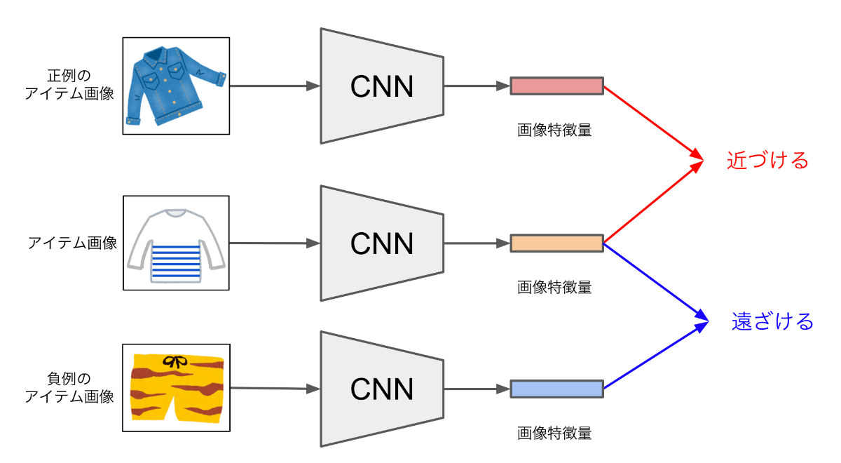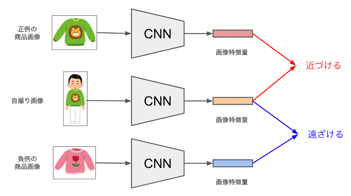 同じアイテムの自撮り画像と商品画像の特徴量を近づける のに使われます。