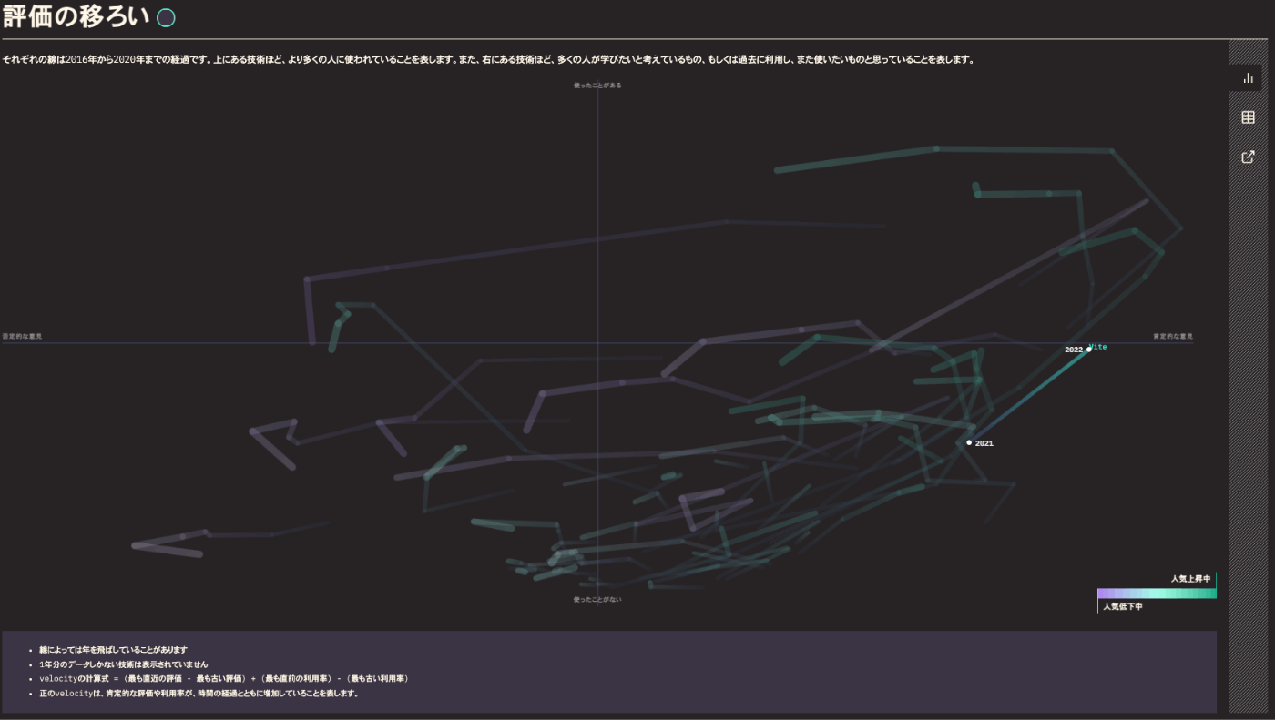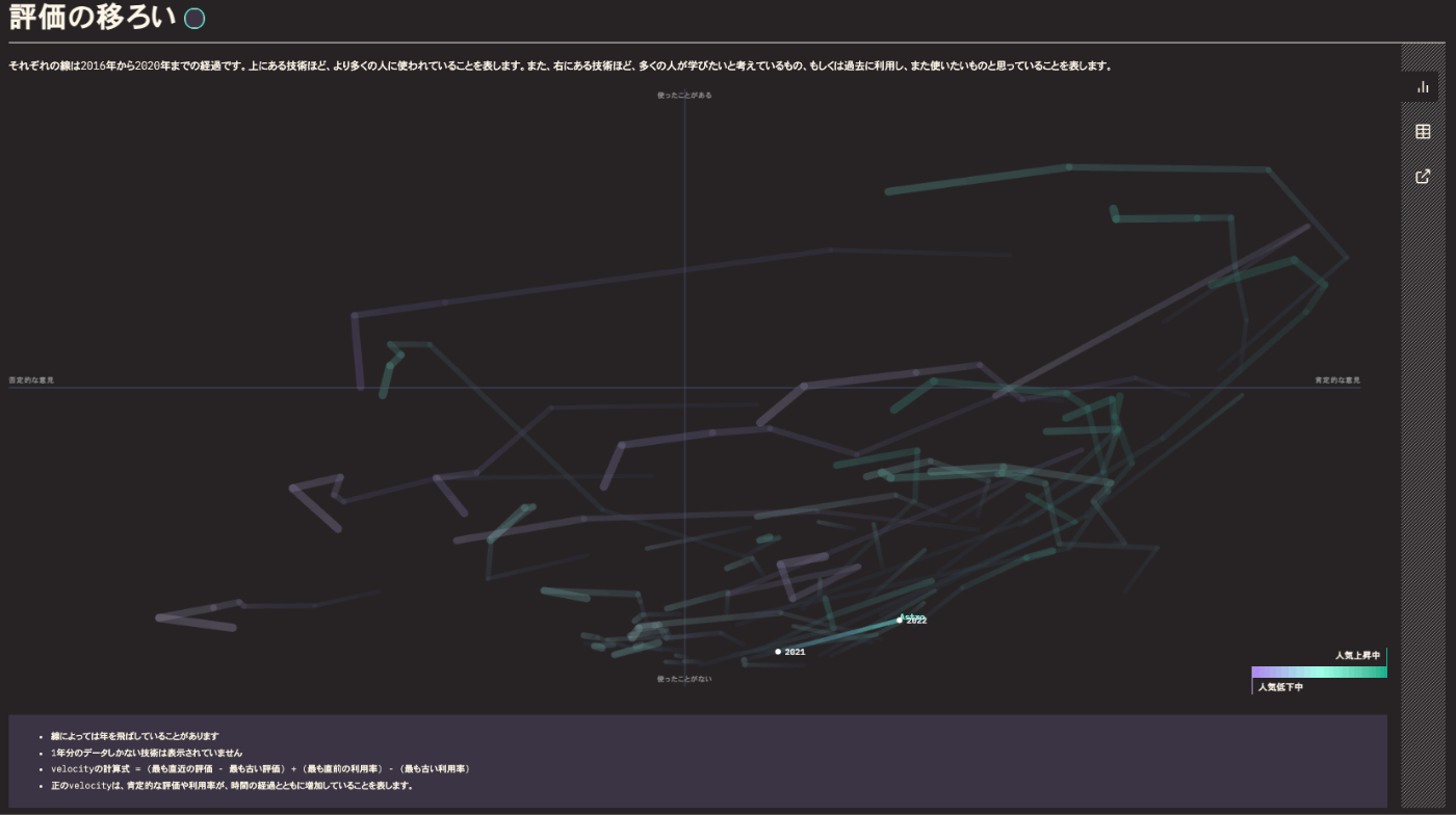 右上に存在する。2020年から否定的な意見が大幅に増加して、使ったことがある人は増加していない。