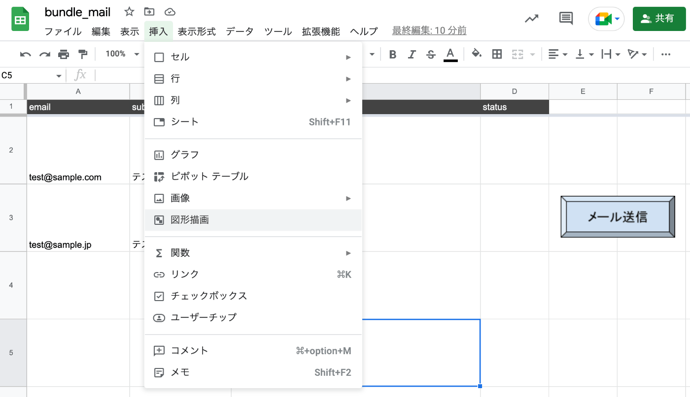 挿入 > 図形描画 からボタンオブジェクトを作成します。