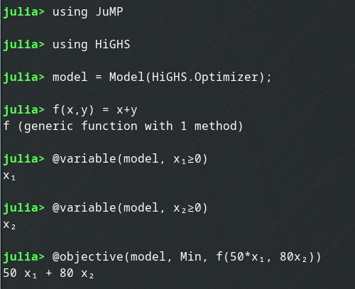 - コメント: 昔授業でやったときは「単に線形で、実行可能領域の頂点に解があるだけ。何が面白いんだろう」と思っていた。今はJuliaで計算できる嬉しさがモチベーションに繋がるのはある。非線形最適化問題を知ってから線形最適化問題を見ると、線形の場合にのみ適用可能な議論が見えてきて面白いのもある。
