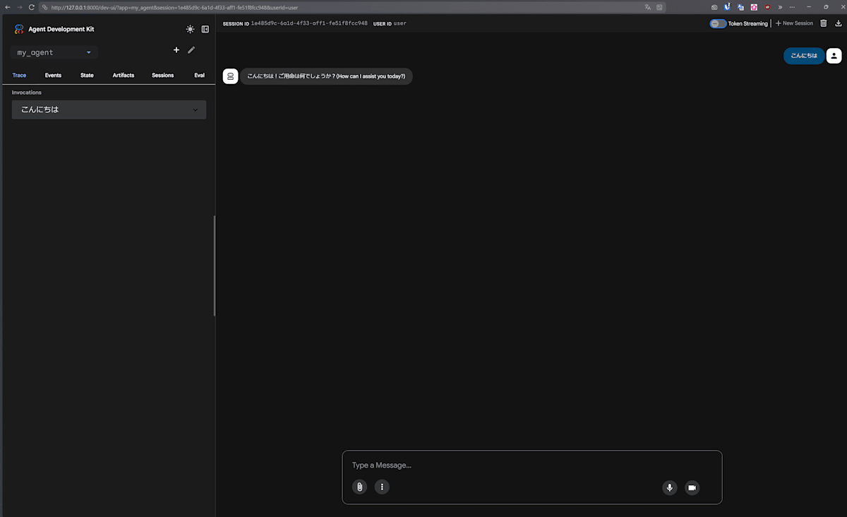 root_agent: こんにちは!今日はどんなご質問がありますか?お手伝いできることがあれば教えてくださいね。