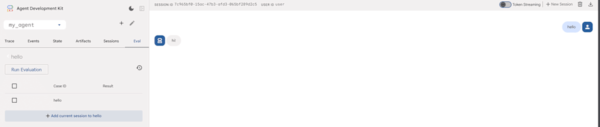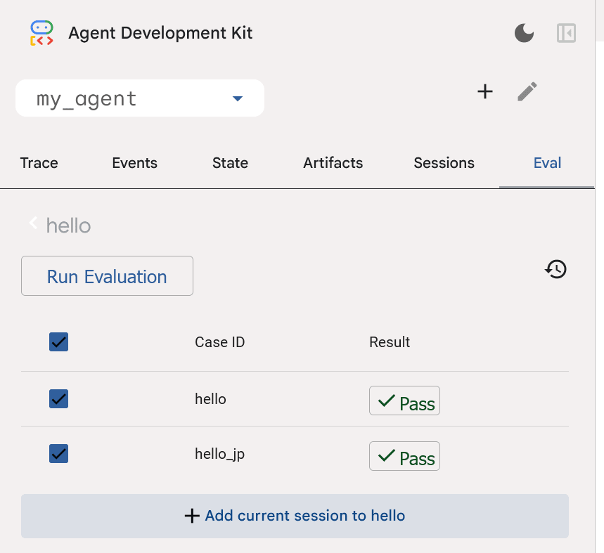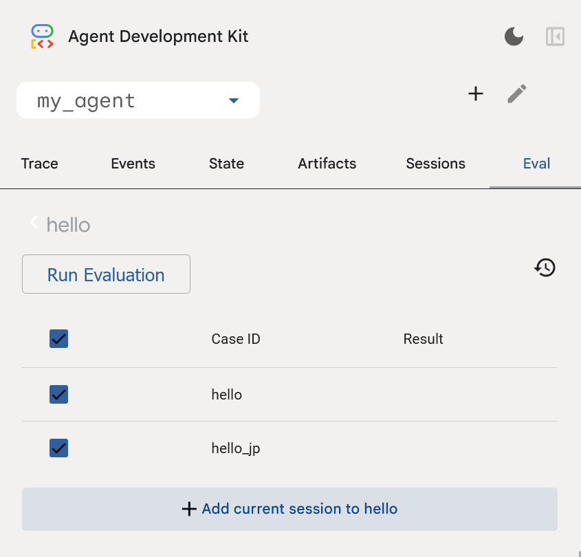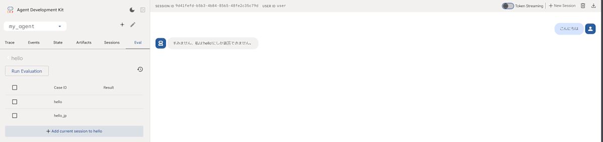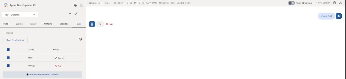 新しいセッションを開始して、エージェントとやり取りを行い、「Add current session to <Evalsetlの名前>」を押すと、やり取りの内容がEvalsetに追加される。以下では2つのやり取りを追加。
