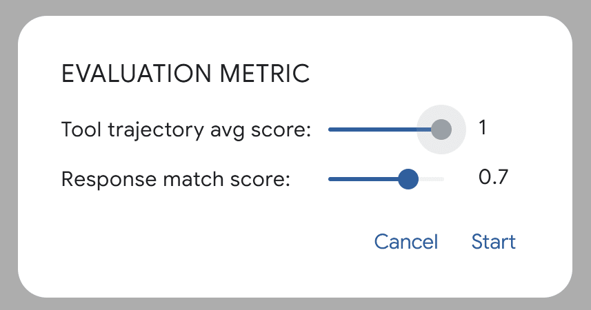 バージョン1.19.0時点ではWebUI上だと、ツール使用の軌跡と最終応答それぞれ固定の評価指標しか選択できないが、実際には何種類か用意されており、adk cliやpytestからの実行なら指定できる。