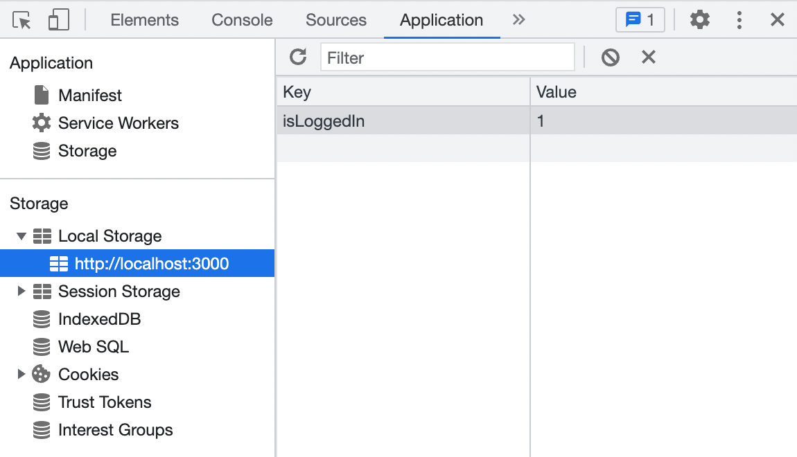 🔖localStorageをチェックする方法2022/08/14に公開ChrometechまずはlocalStorageを設置します localStorage.setItem('isLoggedIn', '1'); ChromeのDev Toolsを開けます、Applicationを選択します 左のパネルのLocalStorageの下の「localhost:3000」をクリックします セーブしておいたデータが見れました Discussion