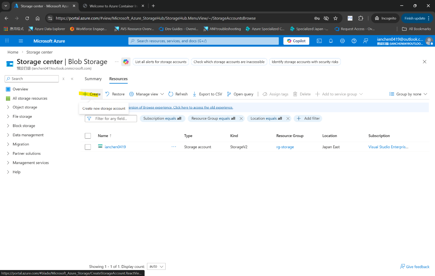 ステージング場所として使用するストレージ アカウントを作成する