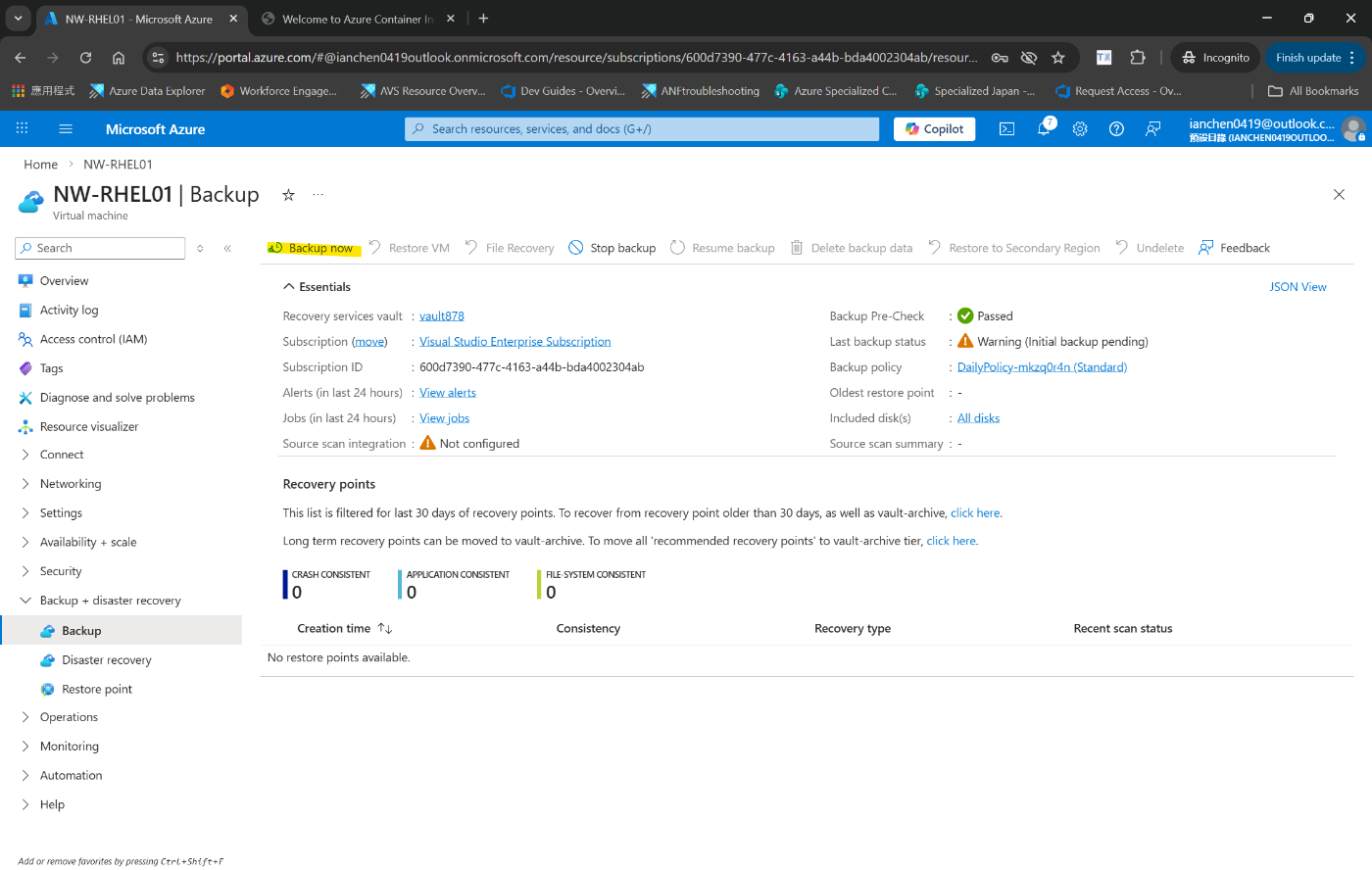 Azure 仮想マシン用のバックアップを作成する