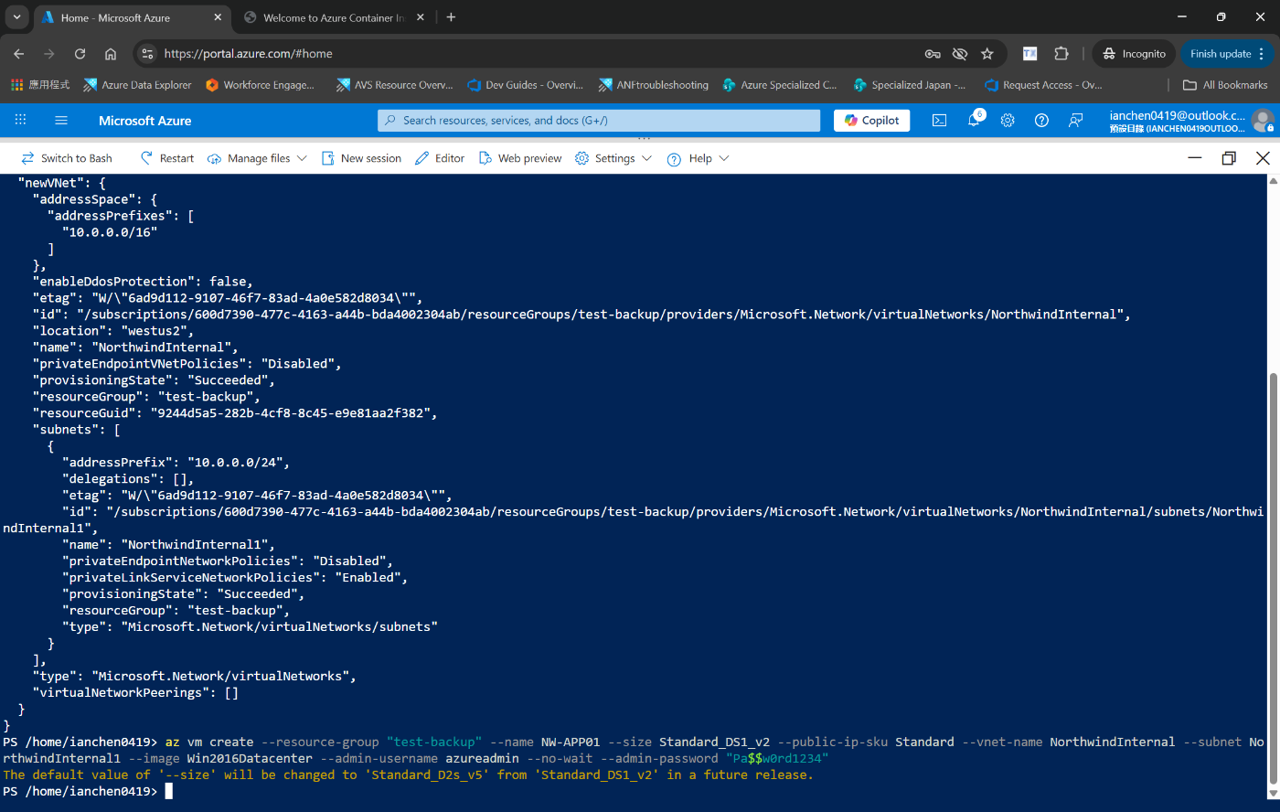 az vm create --resource-group "test-backup" --name NW-APP01 --size Standard_DS1_v2 --public-ip-sku Standard --vnet-name NorthwindInternal --subnet NorthwindInternal1 --image Win2016Datacenter --admin-username azureadmin --no-wait --admin-password <password>