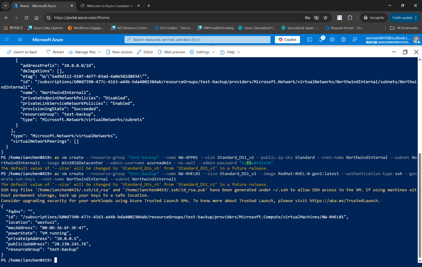 az vm create --resource-group "test-backup" --name NW-RHEL01 --size Standard_DS1_v2 --image RedHat:RHEL:8-gen2:latest --authentication-type ssh --generate-ssh-keys --vnet-name NorthwindInternal --subnet NorthwindInternal1