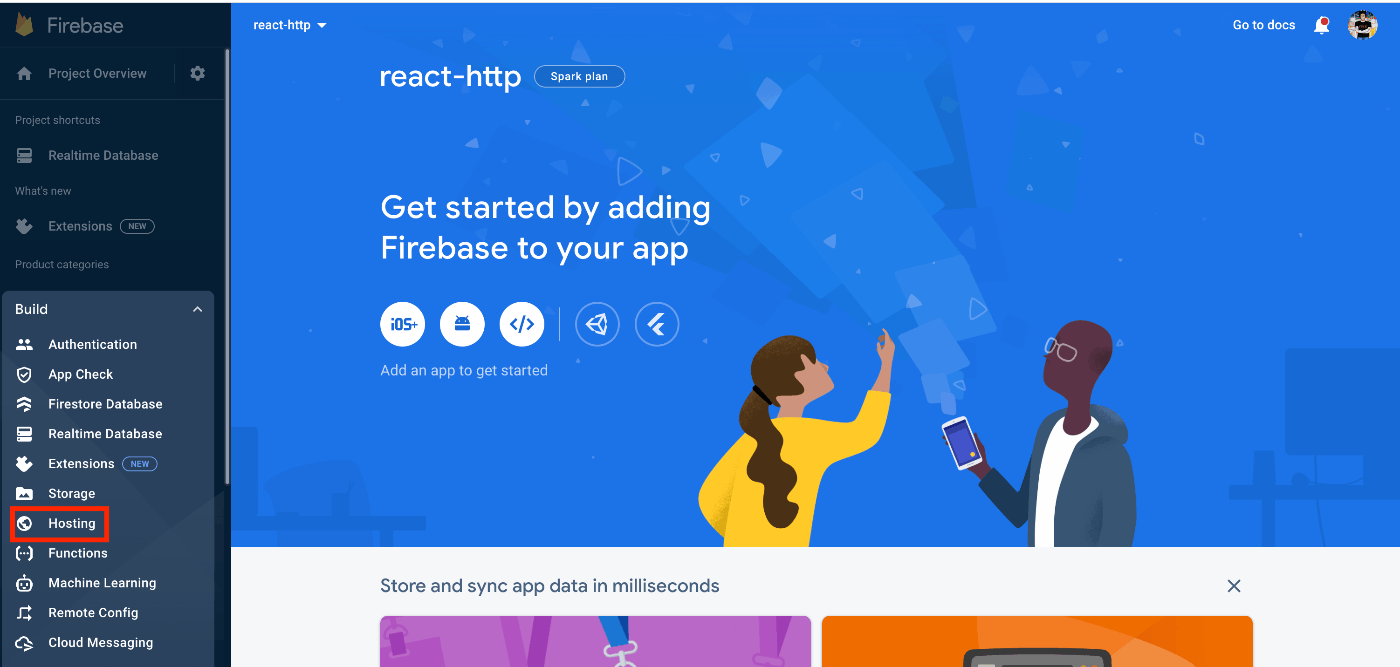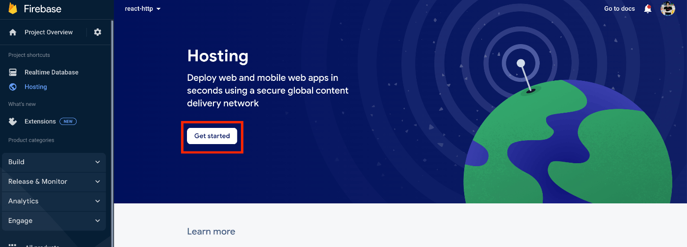 Firebaseのプロジェクトに入り、左のパネルの「Build」の下の「Hosting」をクリックします