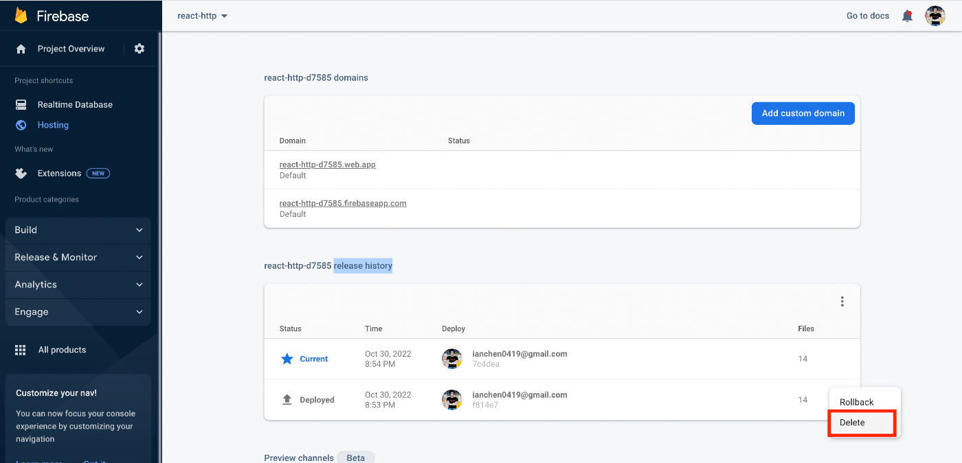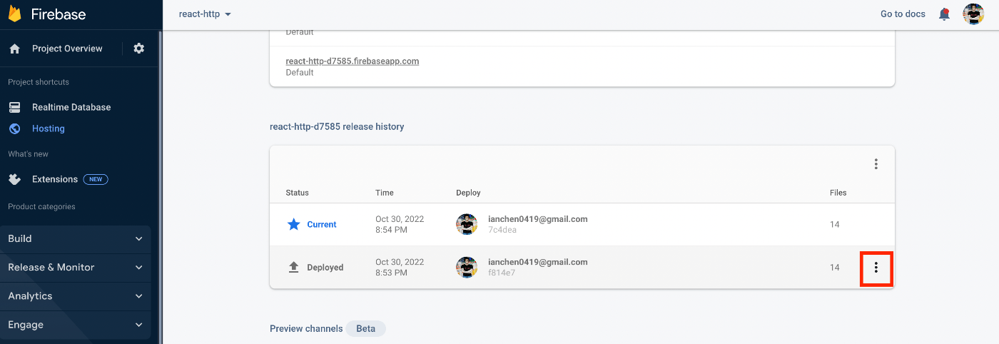 Firebaseの管理画面のrelease historyの項目に「...」のアイコンをクリックします