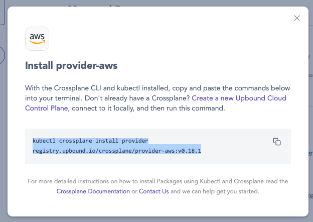 Upbound Registry を開くと下記のように provider を選択してインストール用のコマンドをコピーすることができる。