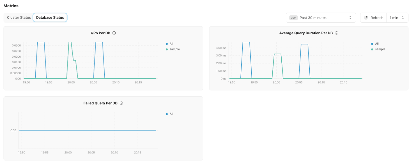 MetricsではクラスターとDBの情報がみえました。見えるメトリクス情報は少なめでしょうか。サーバレスだからということかもしれませんが、たくさんの種類のメトリクスと格闘されていた皆様だとシンプルにみえるかもしれません。
