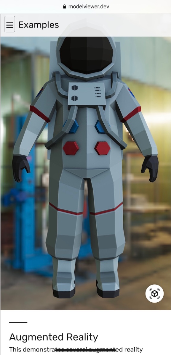 <model-viewer src="../../shared-assets/models/Astronaut.glb" ar ar-modes="webxr scene-viewer quick-look" ar-scale="auto" camera-controls alt="A 3D model of an astronaut" skybox-image="../../shared-assets/environments/aircraft_workshop_01_1k.hdr" ios-src="../../shared-assets/models/Astronaut.usdz"></model-viewer>