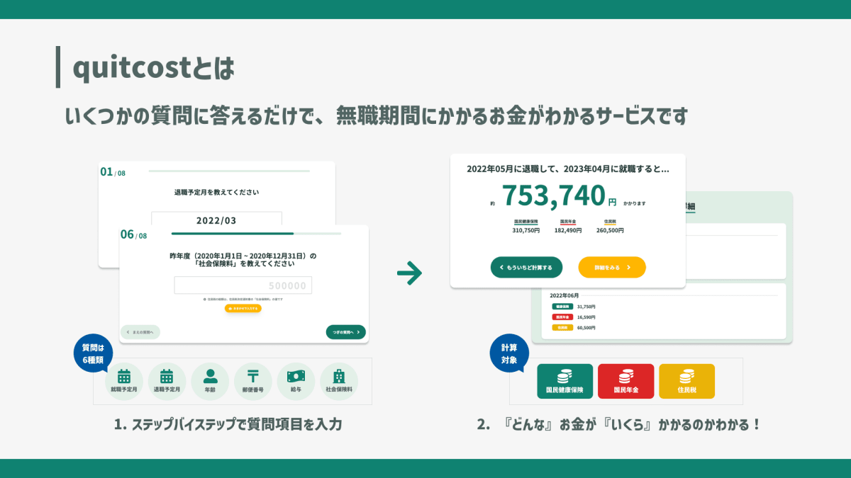 こうして実際にやめる際に仕組みの複雑を実感したこと、またFJORD BOOT CAMPの中でも仕事をやめて勉強をしている方が多くいたこと、これらをきっかけにこのサービスを作ろうと思いました