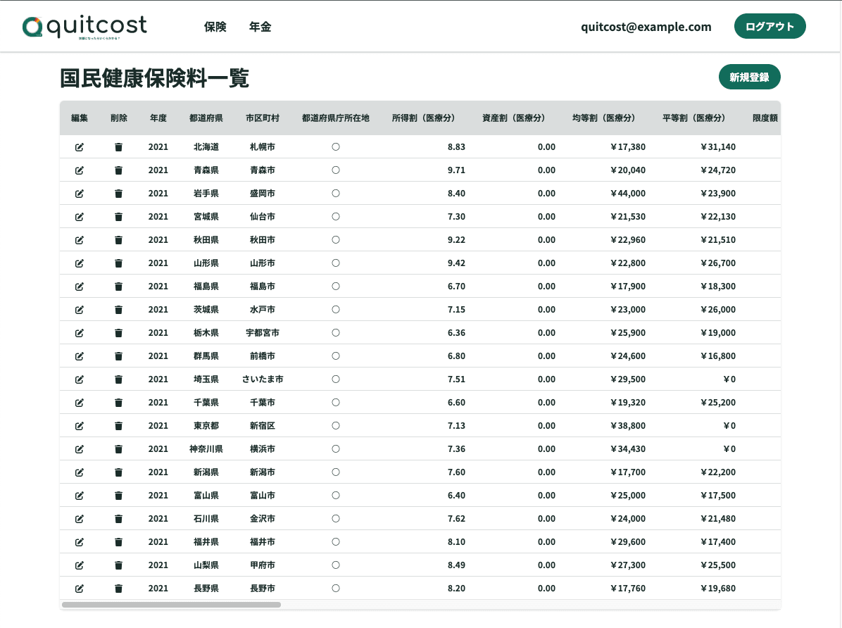 このサービスでは計算のために、「各市区町村別の国民健康保険料の料率」をDBに保持して、管理画面に表示しています。