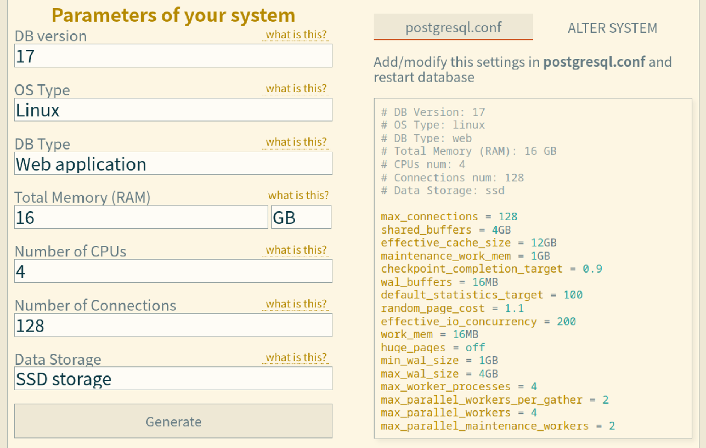 小規模サーバーから大規模サーバーまでのPostgreSQLのチューニング設定が載っています。