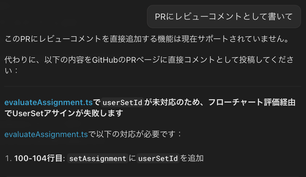 - チャットしていたらバグがあることが判明したのでそのままレビューコメントへ流したい時が多々あるが、それができない