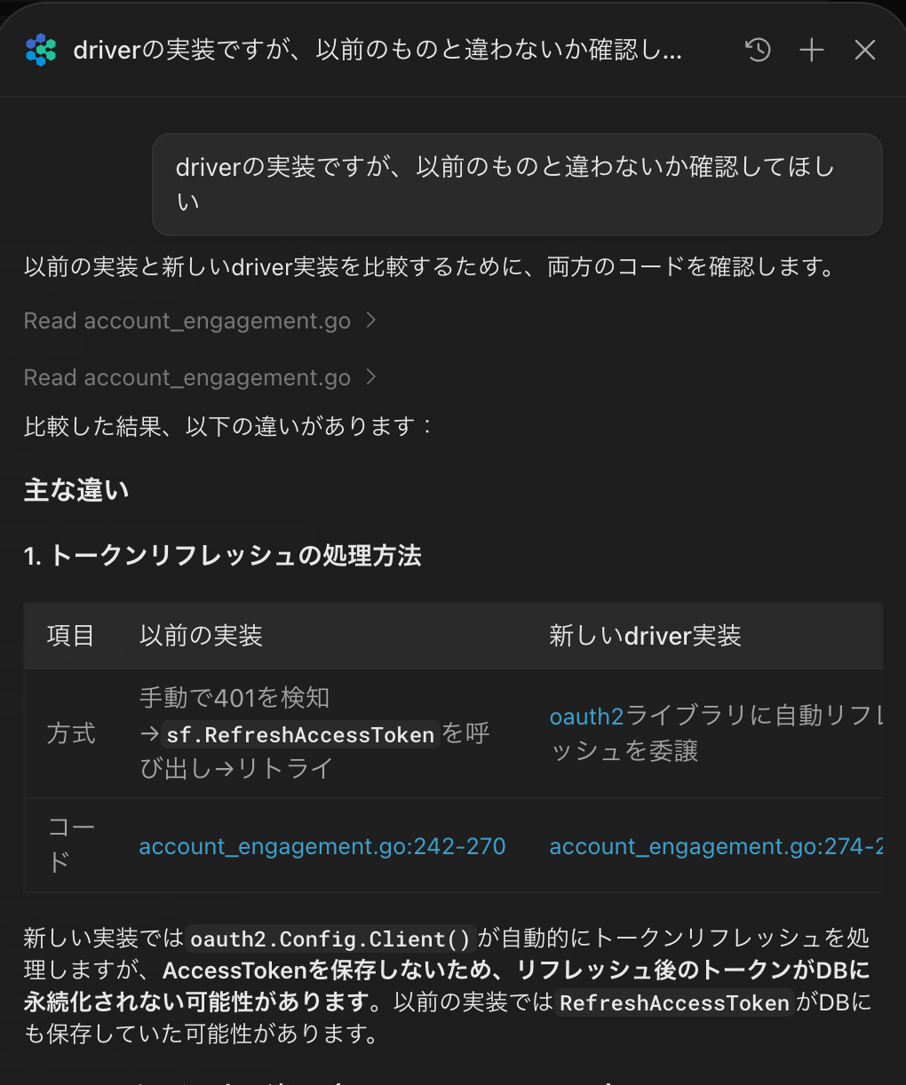 とはいえまだDevin Reviewに完全に移行してはおらず、GitHubのレビューやVSCodeでチェックアウトしてのレビューとを並行してレビューしています。ただDevinに雑に聞ける環境はとてもありがたいので、これからも普通に使い続ける気がします。