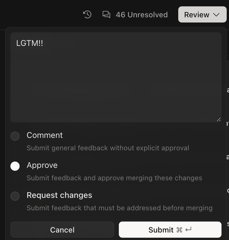 また、レビューを提出する時にはGitHubと同じようにComment, Approve, Request Changesを選べます。