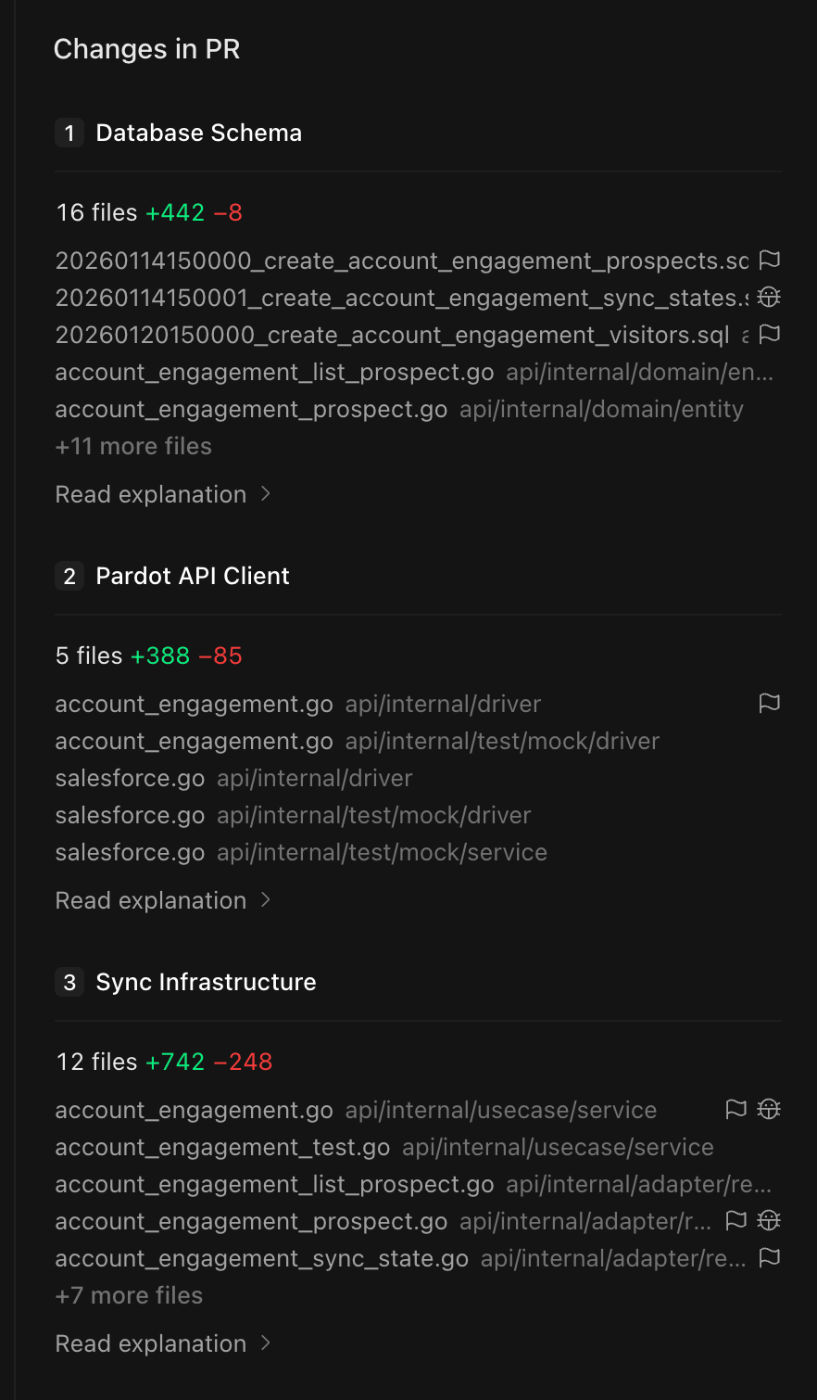 「変更が意味的にまとまって見える」「わからないことは雑に(スピーディーに)AIに聞ける」という2点が、毎日大量にレビューをする自分としては非常に嬉しい機能でした。