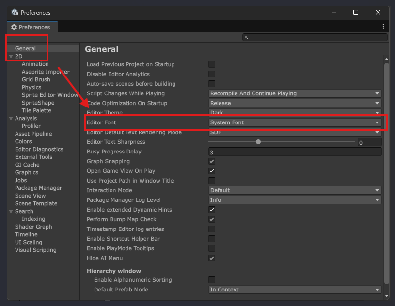 - 左リストから General を選択し、 Editor FontをSystem Fontにする