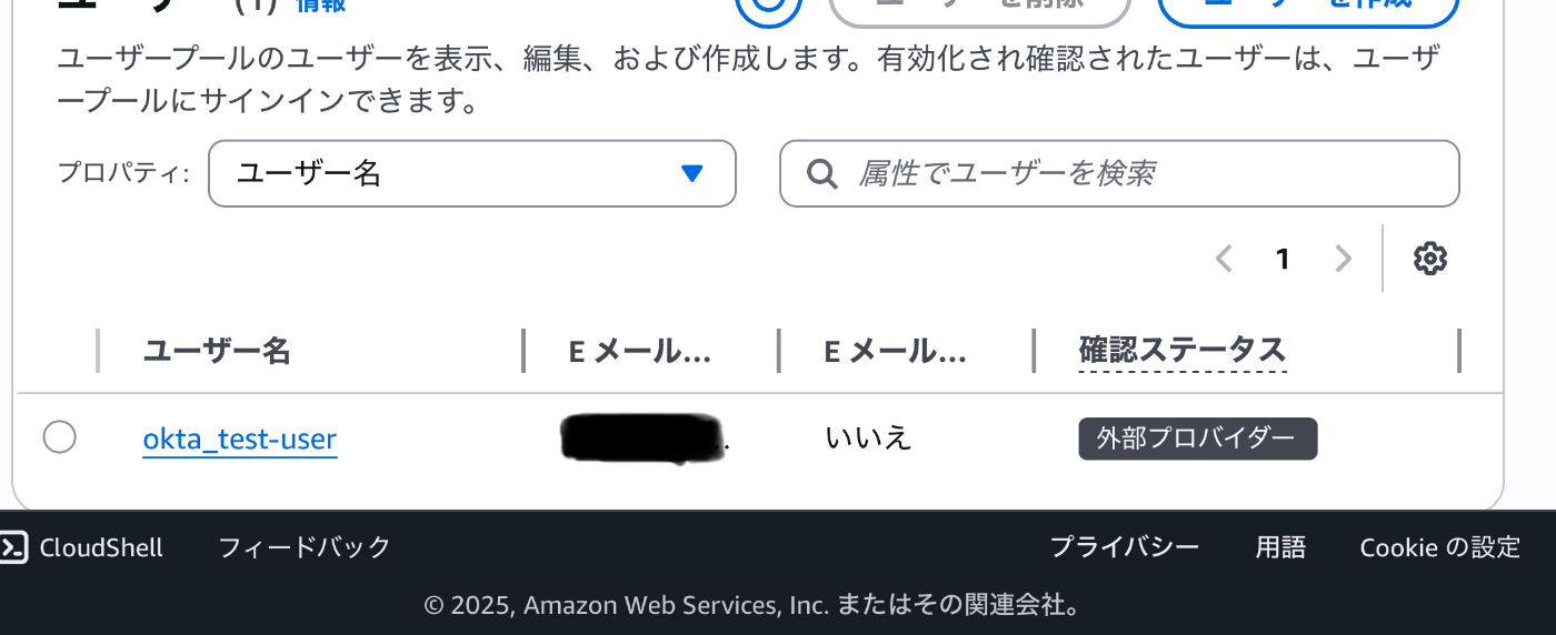 Cognito のユーザープールを確認すると、Okta のユーザー分のユーザーが登録されていることがわかる。