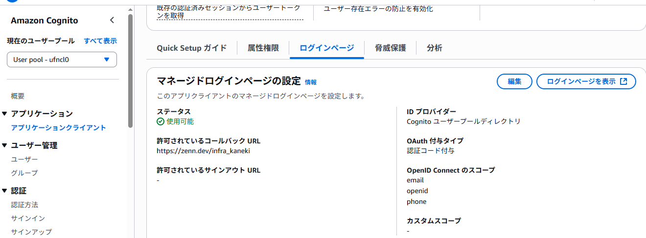 「アプリケーションクライアント」→「自分の作成したユーザープール」→「ログインページ」タブで「編集」に進む。