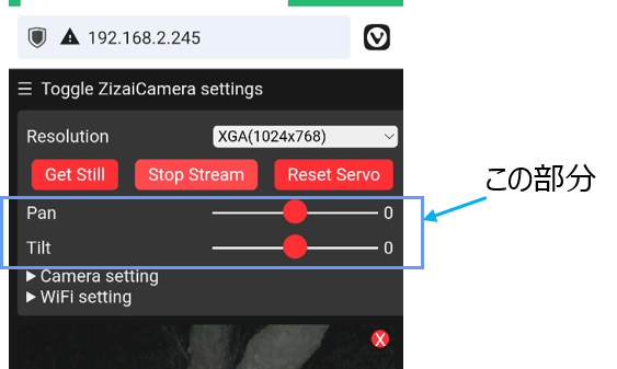 「5. Timer Camera Xの制御」に書いたように、自在カメラではスマホやPCからブラウザで制御します。で、その制御用のWebページ(camera_index.hに記載)にサーボのコントローラーを追加しました。